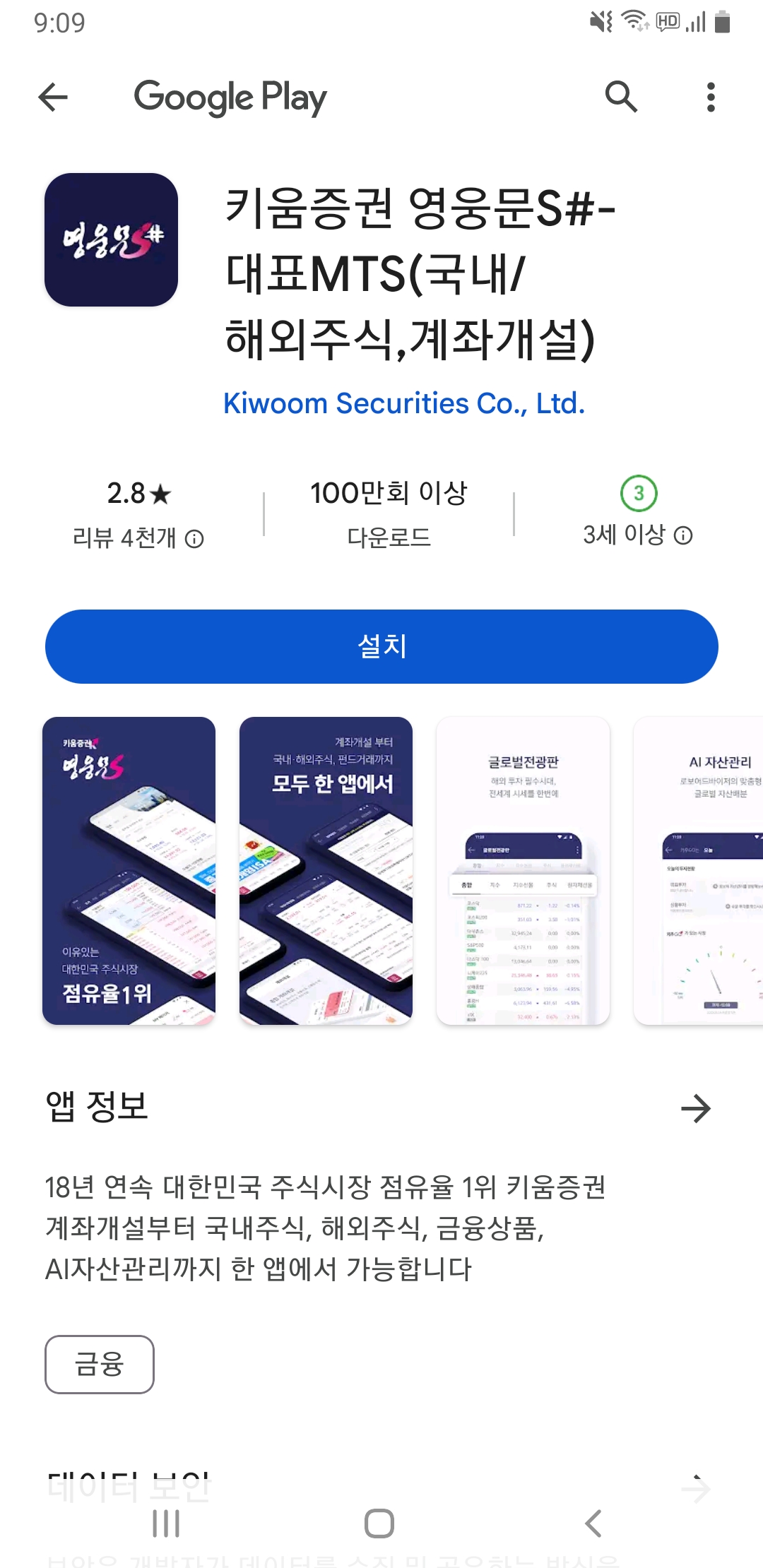 QR코드를 인식하면 구글 플레이스토어로 연결이되고 설치하기를 누르면 영웅문S # MTS가 설치가 됩니다.