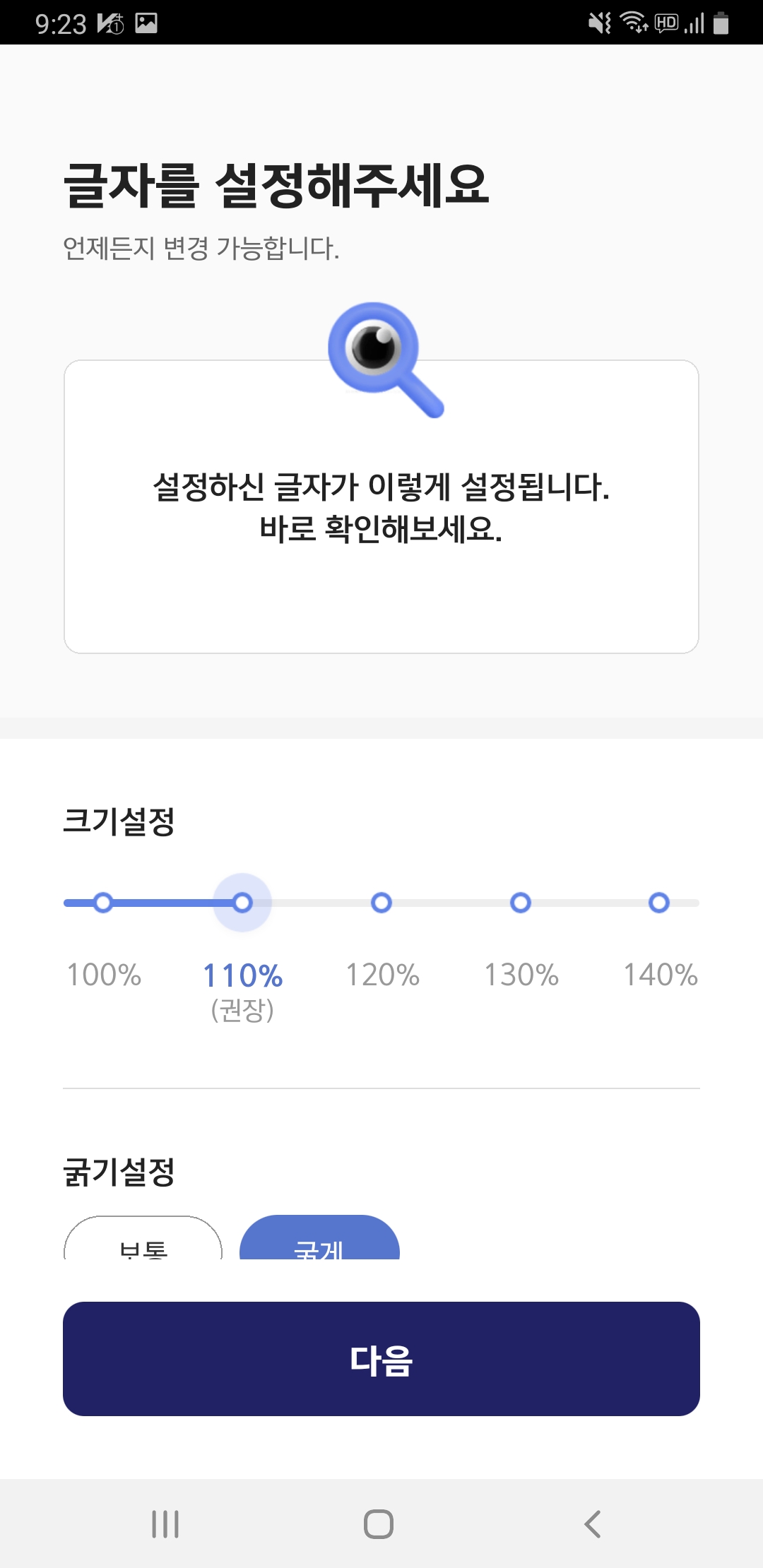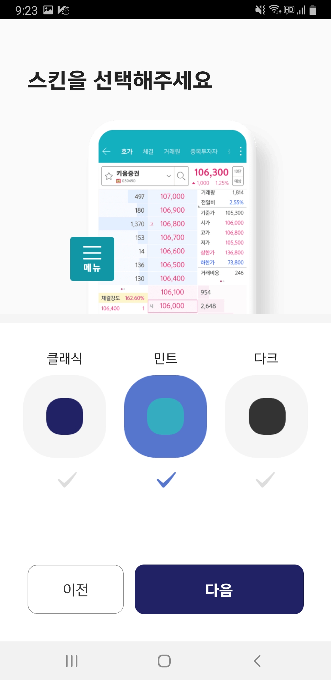 글자크기(다음 버튼 클릭)와 스킨(색상 선택 후 다음)을 선택해주면 영웅문S 시작하기 화면이 나옵니다.