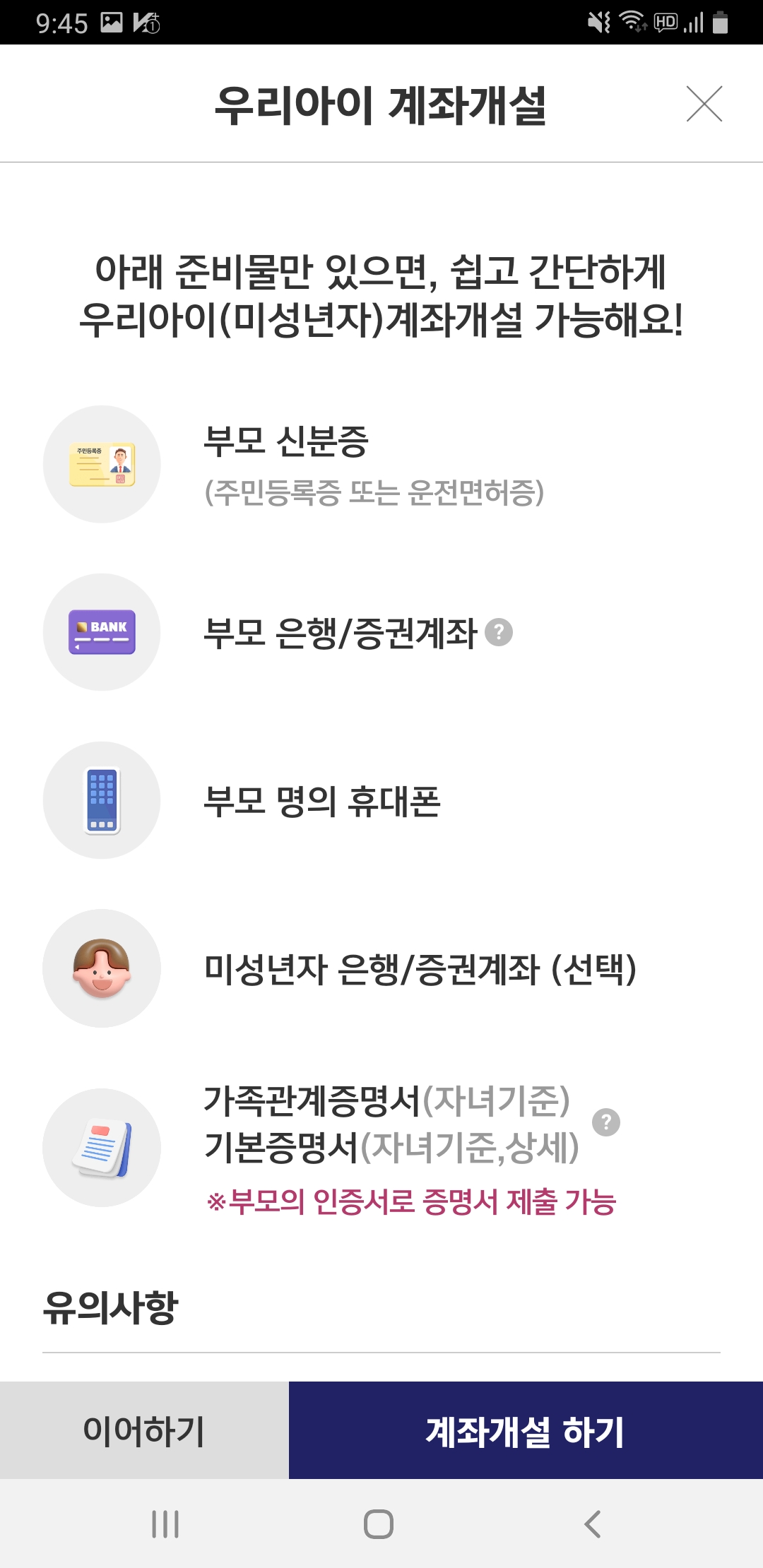 부모님 신분증, 휴대전화, 은행 또는 증권계좌, 가족관계증명서(주민번호 전부공개), 기본증명서(자녀명의 상세증명서, 주민번오 전부공개) 가 반드시 필요합니다.