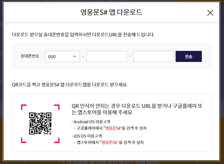 3. 휴대폰 번호를 입력하고 링크를 받거나 QR코드를 통해서 앱을 다운로드 받습니다.