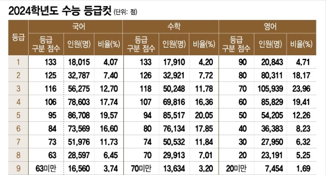 1등급 비율 수능 국어 수학 표준점수 난이도 등급컷