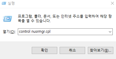 위의 이미지에서 처럼 control nusrmgr.cpl 입력 후 확인 눌러주면 쉽게 해결됩니다.